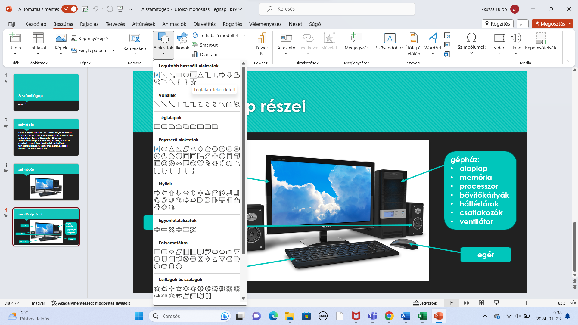 Az alábbi példában a számítógép részeihez magyarázatot készítettünk, melybe alakzatokat szúrtunk be (lekerekített téglalapot), illetve nyilakat.