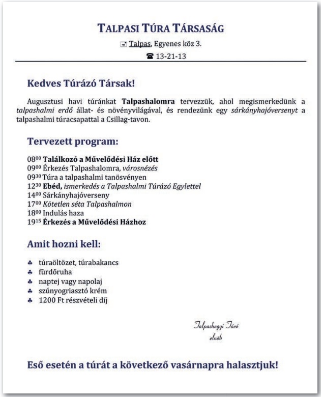 A dokumentum szövege az aláírás kivételével sötétkék és fekete Cambria típusú betűvel készült. A betűk mérete a társaság nevében 20 pontos, a köztes címeknél 16, a többi esetben 12 pont. Az aláírás esetén alkalmazzunk egy kézírást utánzó betűtípust!