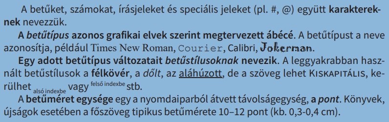 - Betűstílusok: félkövér, dőlt, aláhúzott, kiskapitális, alsó- és felső index
