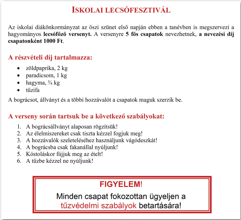 Órai feladat: Készítsd el Wordben az alábbi dokumentumot, majd mentsd el Saját_Név_Lecsó.docx néven! A forrásfájlt itt találod:
