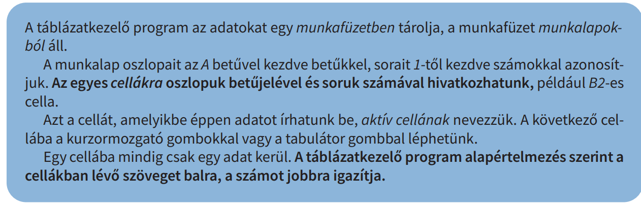 Egy cellába mindig csak egy adat kerül. A táblázatkezelő program alapértelmezés szerint a cellákban lévő szöveget balra, a számot jobbra igazítja.