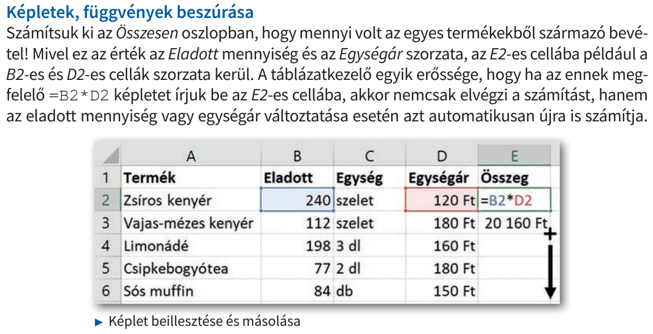 A képletet az egér húzásával másolhatjuk. Másoláskor az érintett cellákba – ha mást nem írunk elő – a másolás irányának megfelelően módosított képlet kerül.
